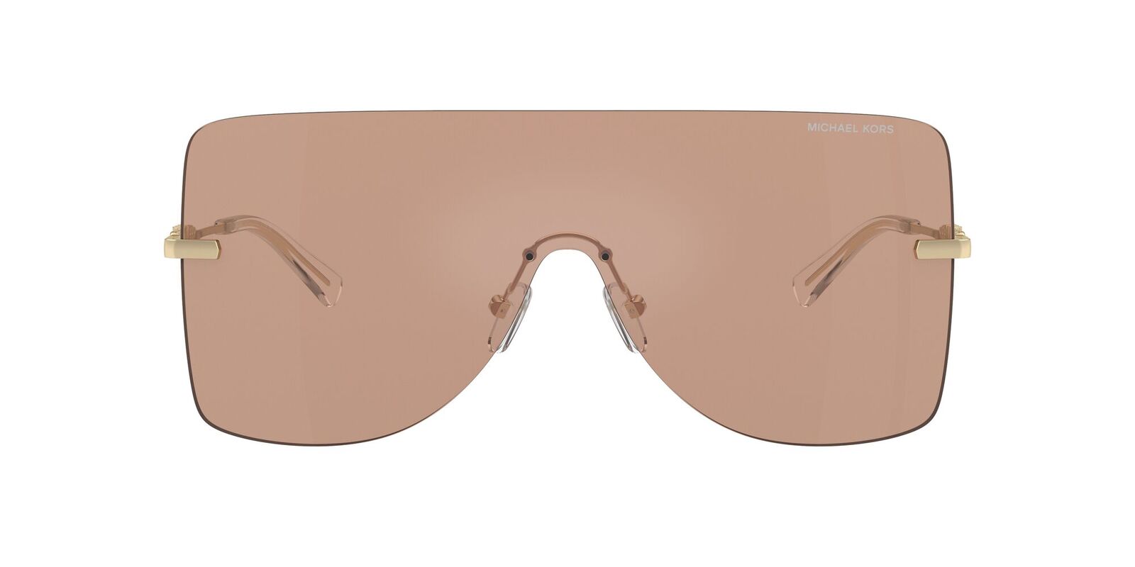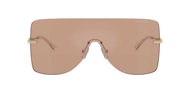 Introducing the Michael Kors London sunglasses in gold with bronze mirror lenses, an embodiment of sun style and sophistication. The oversized metal shield design remains a staple in MK eyewear, always on-trend and effortlessly glamorous.