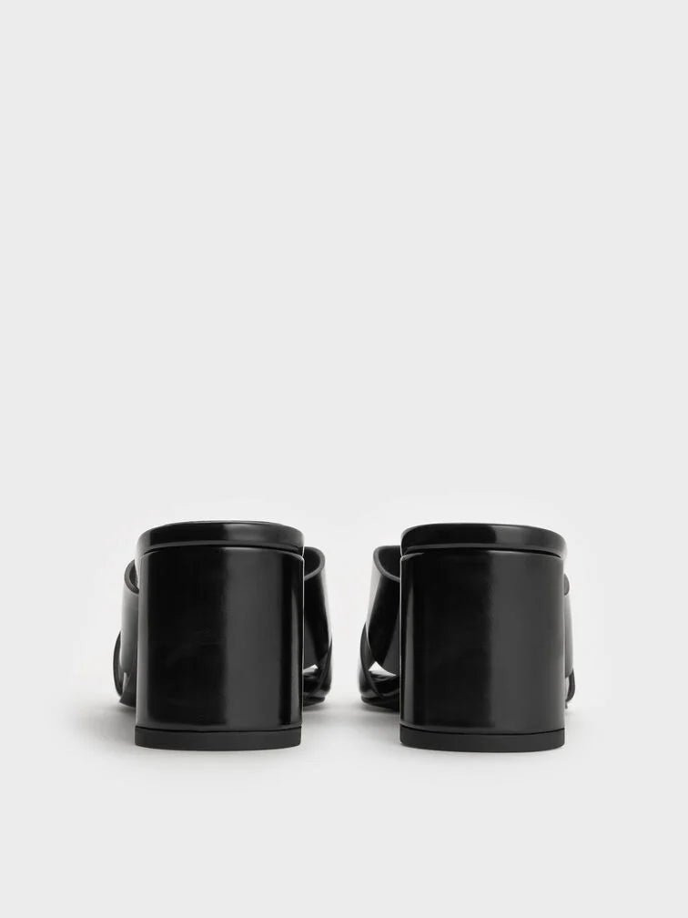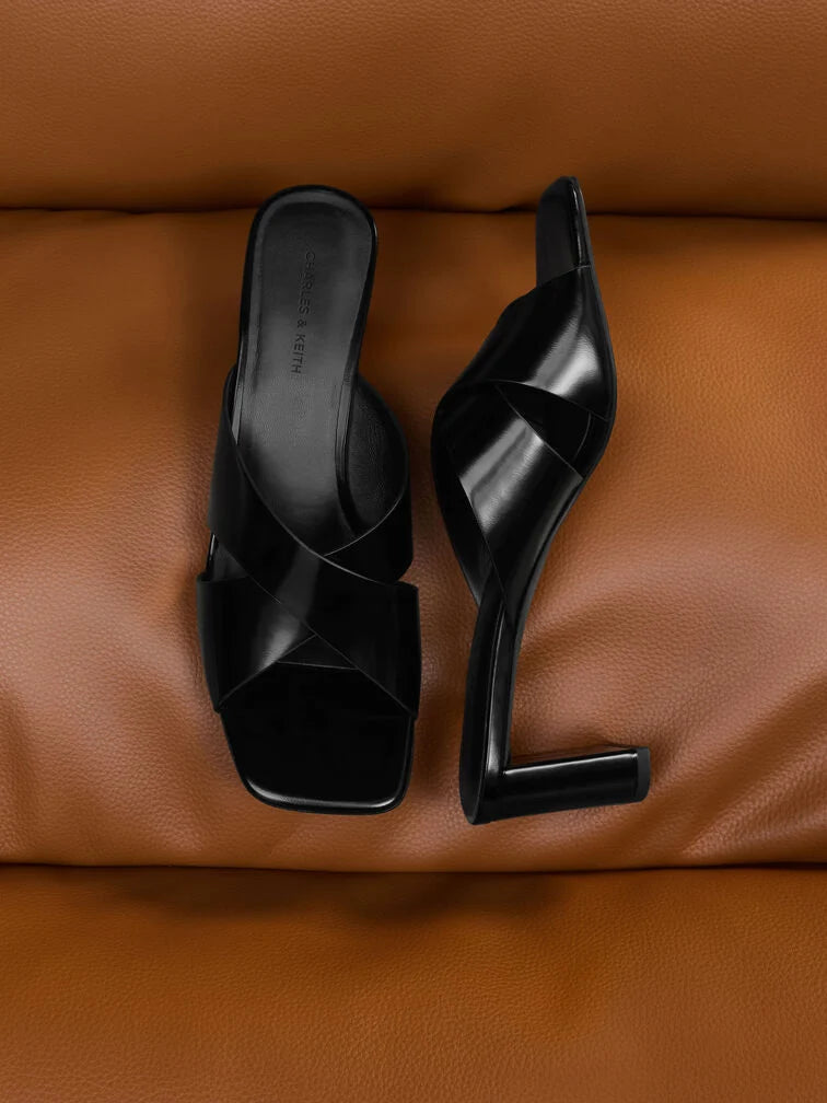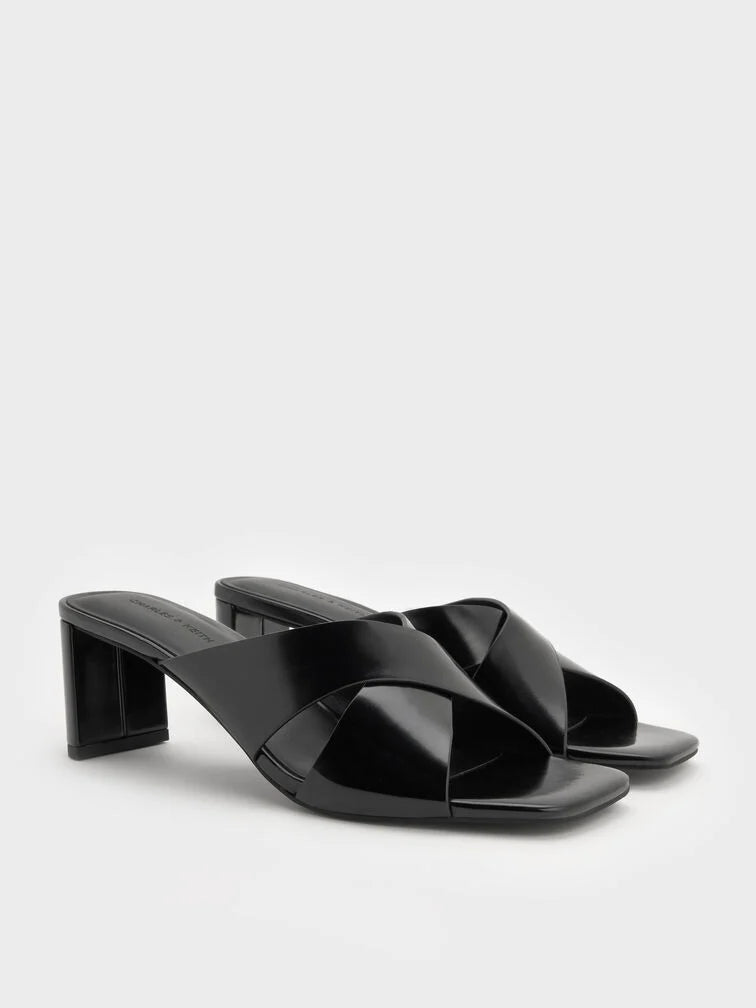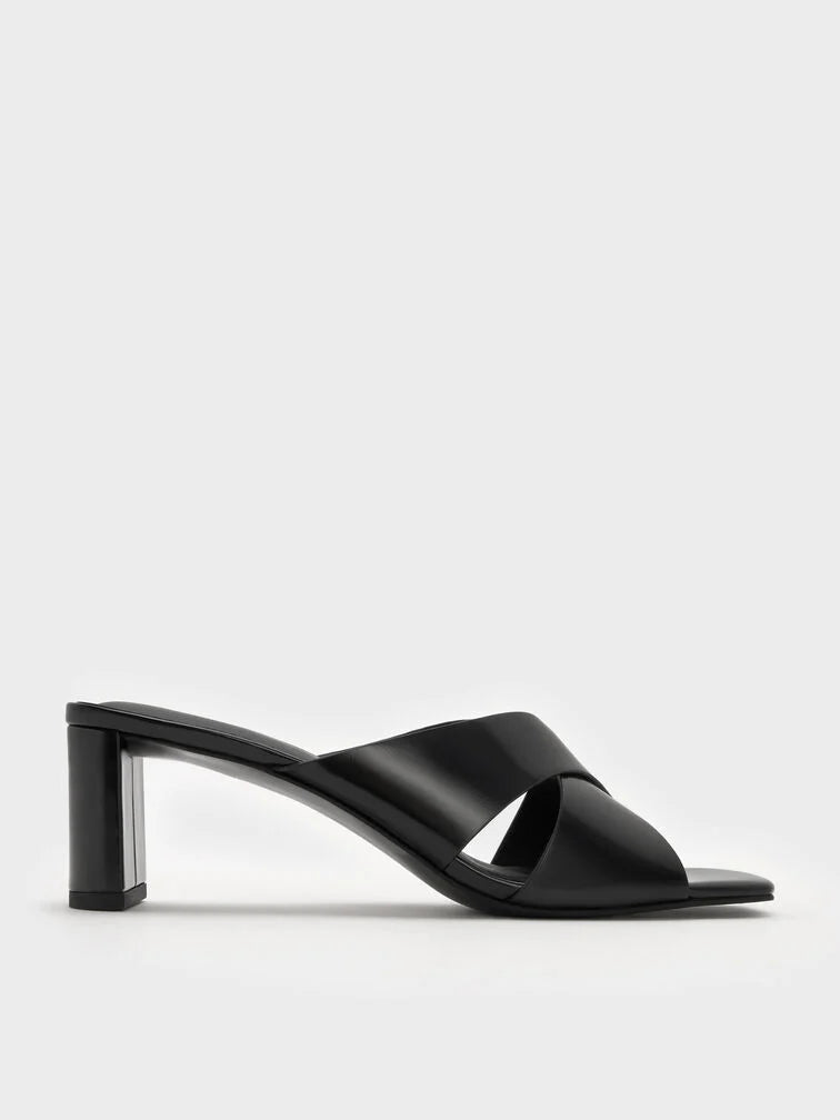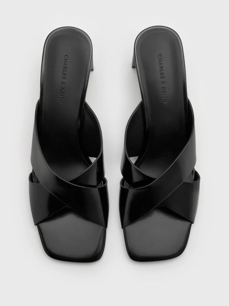 These Georgina mules in black feature crossover straps, round toes and blade heels. Wear them with midi pencil skirts and tucked blouses to establish a quietly assured look ideal for workplace settings.