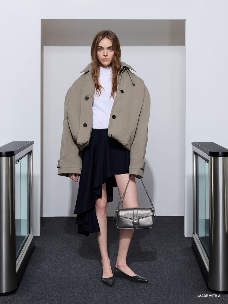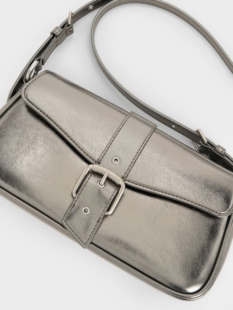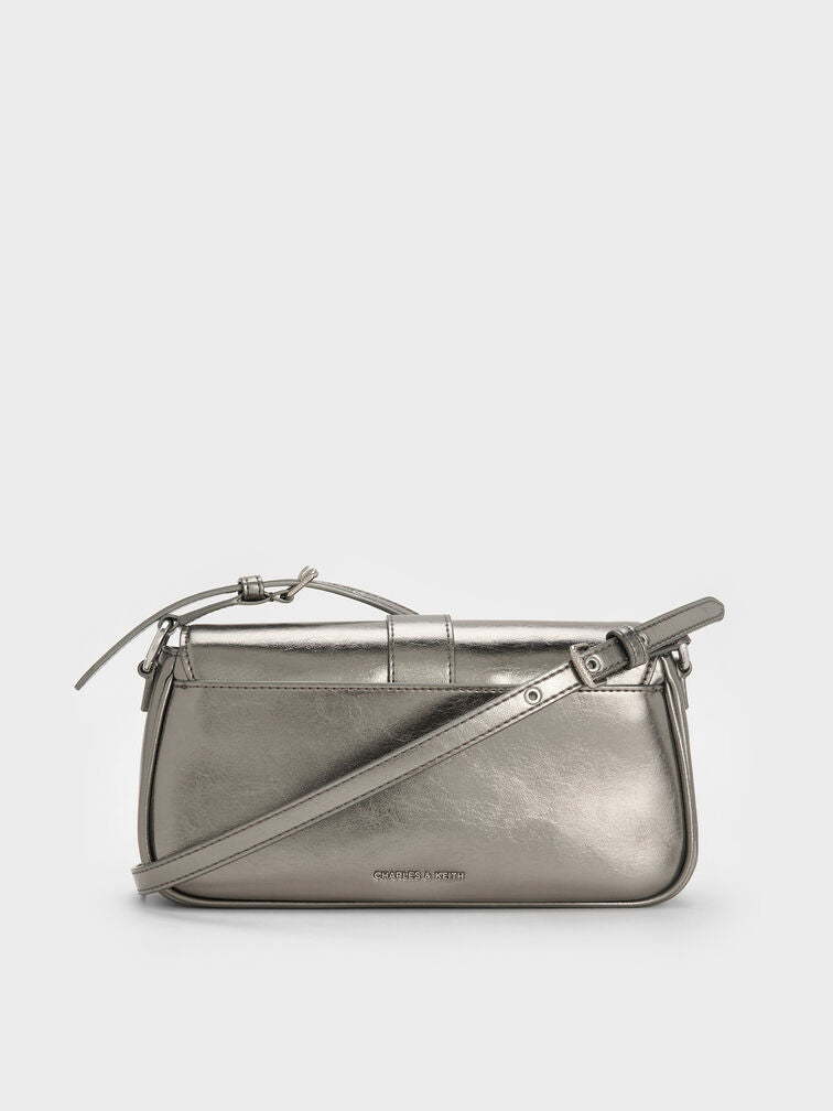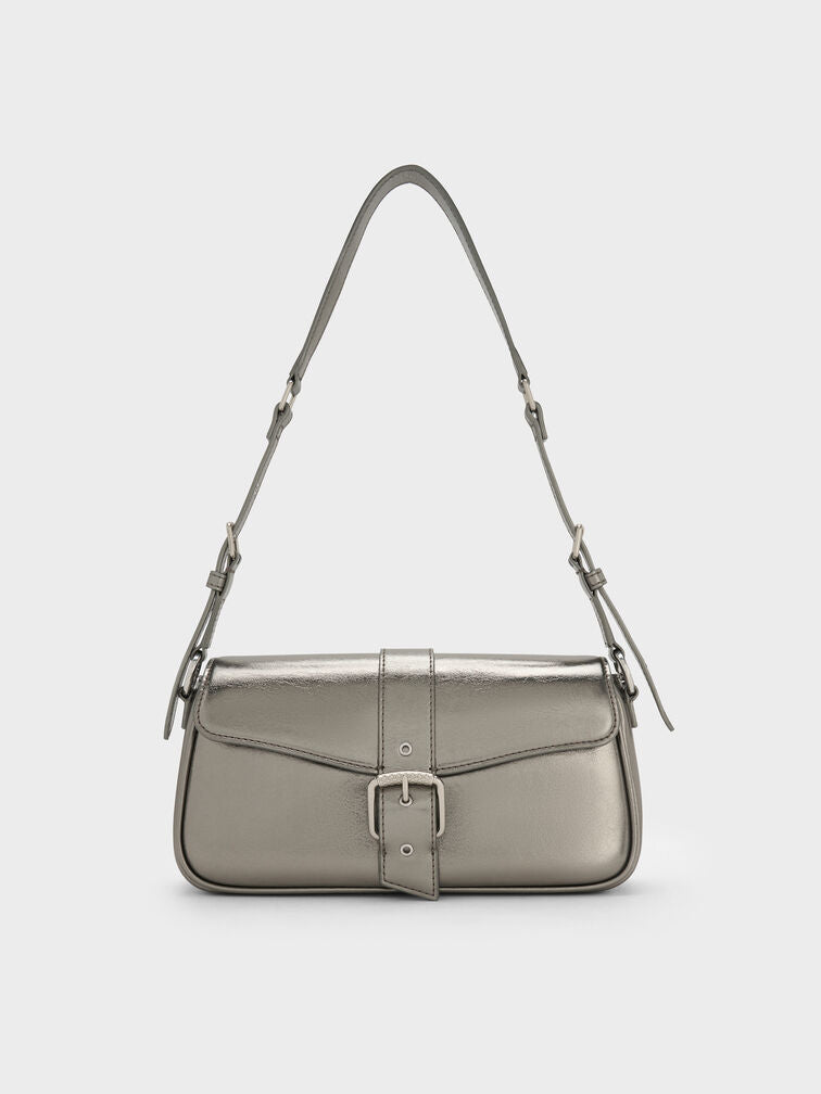 This Blaise shoulder bag in pewter features a metallic finish, a belted strap, a neat structured construction and softly rounded corners. Pair it with monochromatic outfits to create a polished look that balances style with utility.