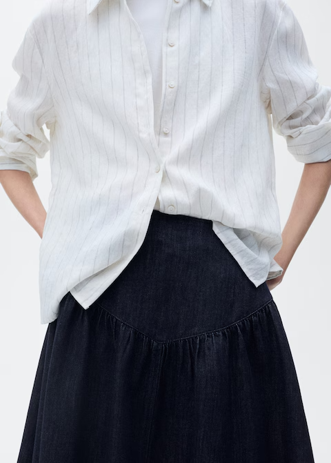 Denim-style cotton fabric. Midi design. A-line design. High waist. Zip fastening on the back section. Composition: 100% cotton. Designed in Barcelona. Manufacture: Türkiye. Dye/printing: Türkiye. Weave: Türkiye.