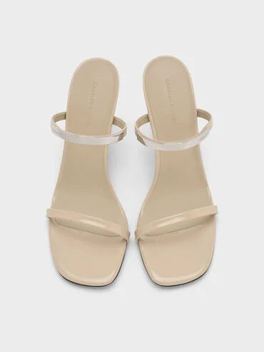 These heeled sandals in beige feature a patent finish, a double-strap design, metallic accents and flared heels. Pair them with airy summer dresses or cropped trousers for a polished yet relaxed aesthetic.