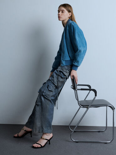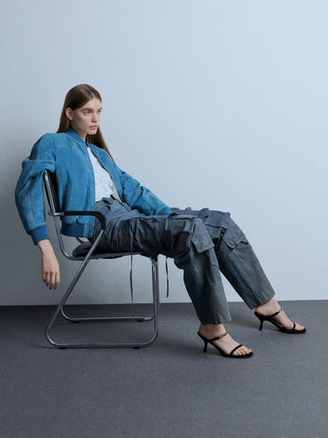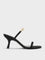 These heeled sandals in black are made with faux suede and feature a double-strap design, metallic accents and flared heels. Use them to elevate tailored separates with striking shine and elegant structured.