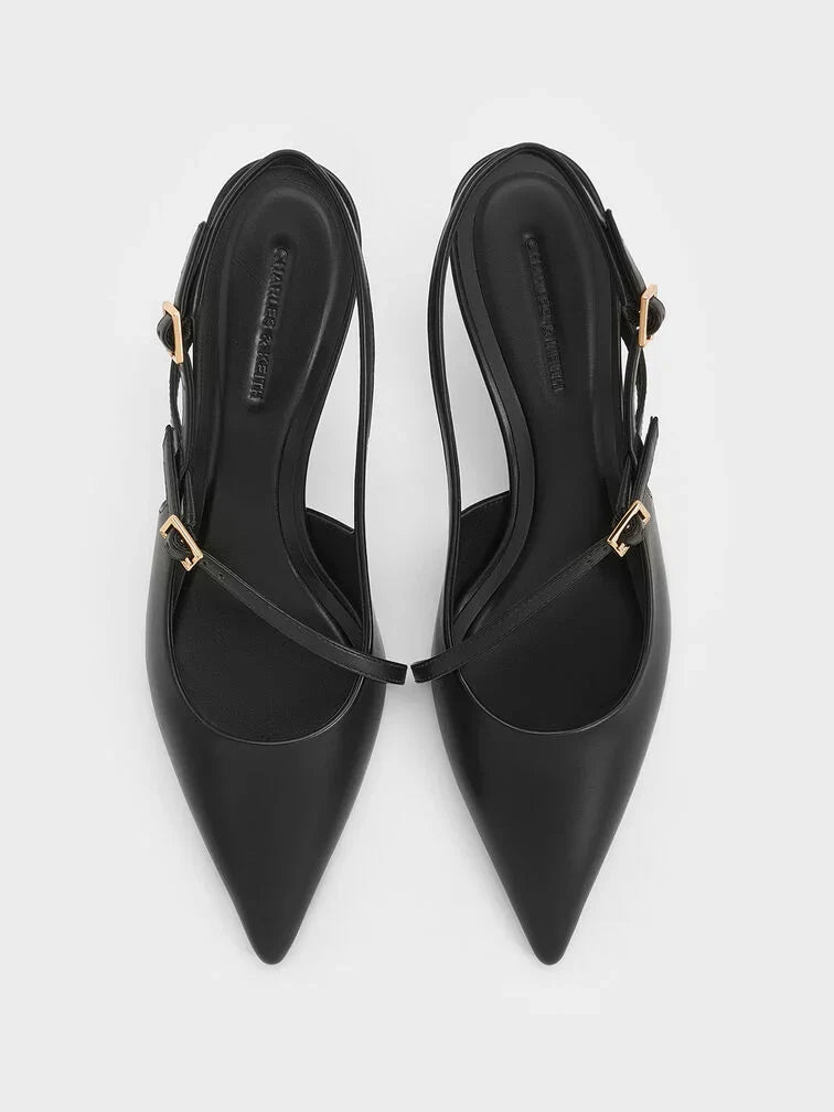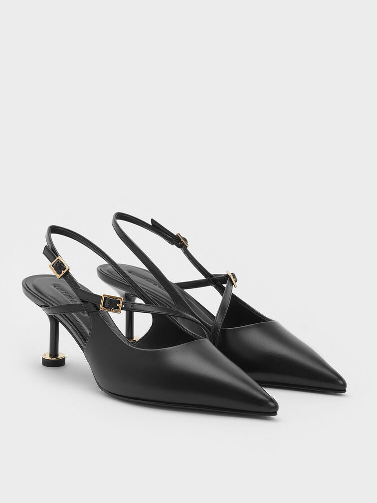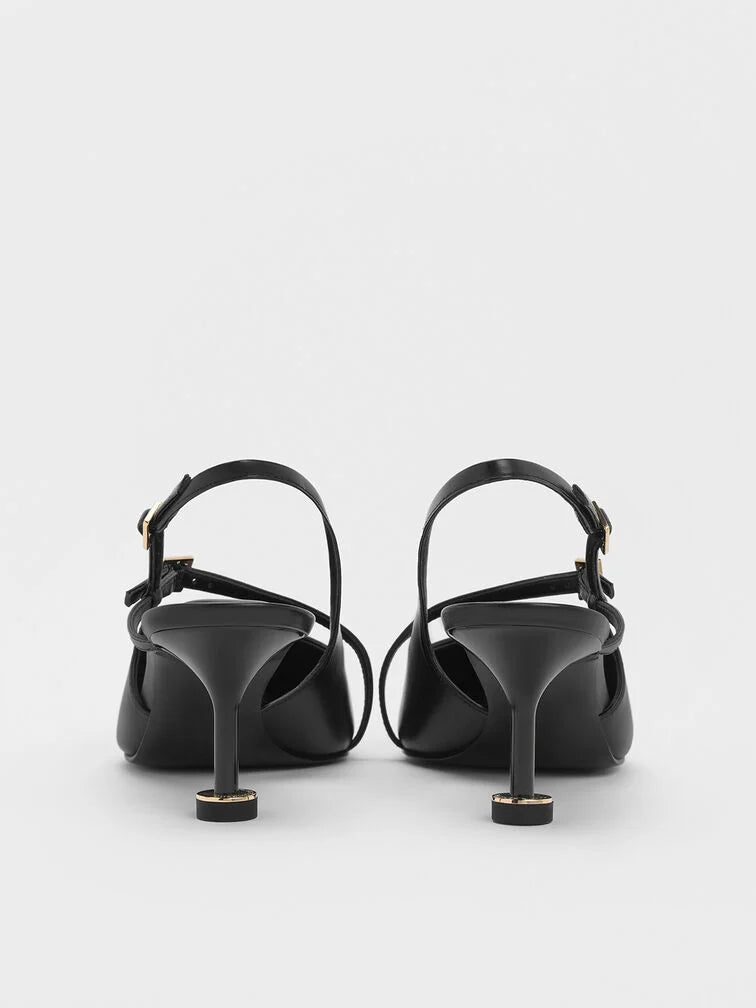Sharp and polished, these black slingback pumps blend the classic with the edgy. Featuring thin buckled straps that cut across the vamps, their striking heels will give both your stature and confidence a boost.