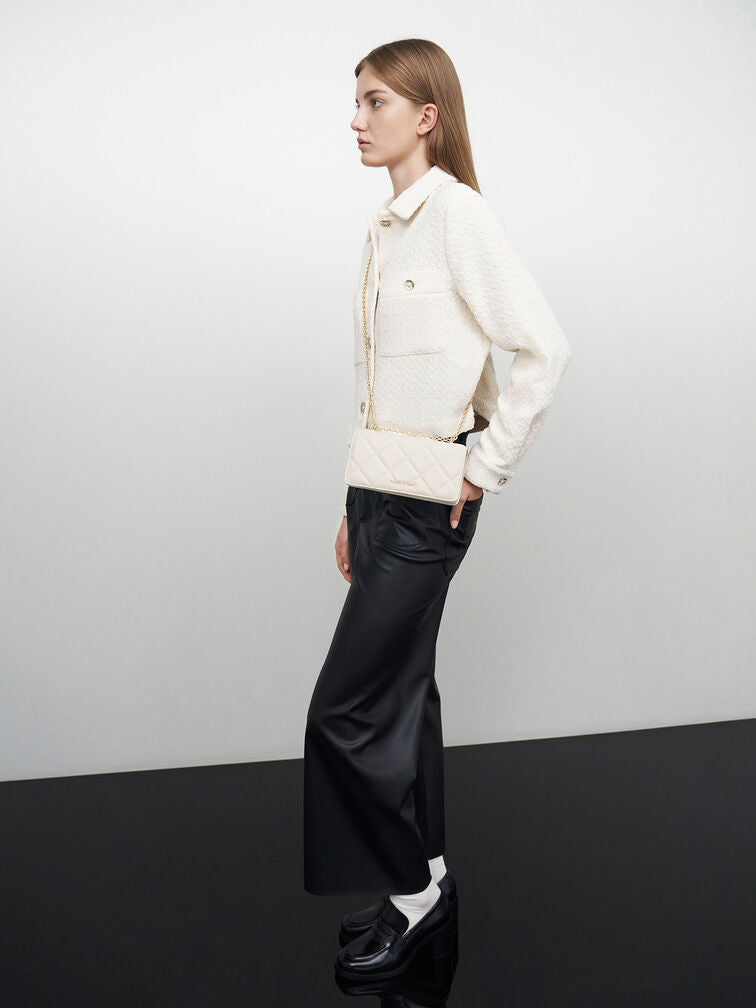 The one wallet you will always want to take out. Find any occasion to show off the exquisite quilted design and elegant cream white hue. Throw on the gorgeous chain handle and not only will you add extra bling to your outfit, but you can also go hands-free, giving you one less thing to worry about when you are out and about. For a chic look, we recommend styling our Paffuto wallet with a wide-leg jumpsuit and stiletto heel pumps.