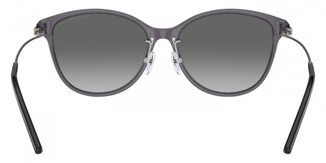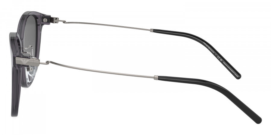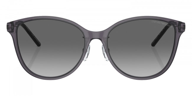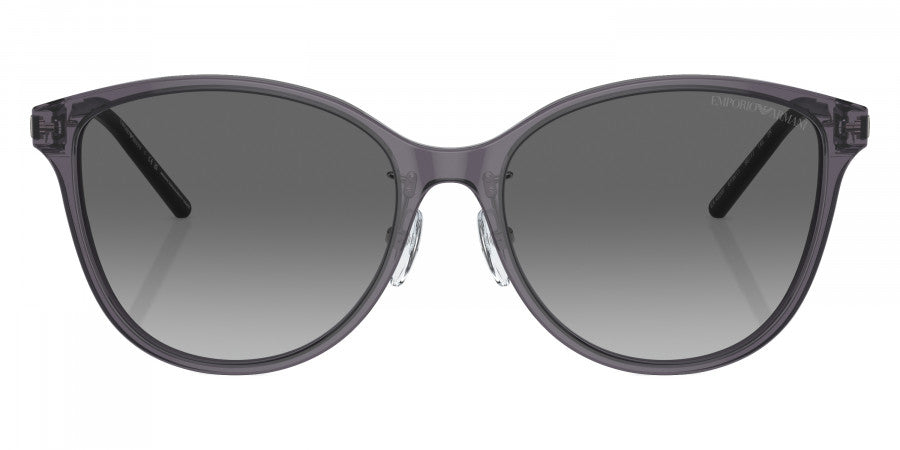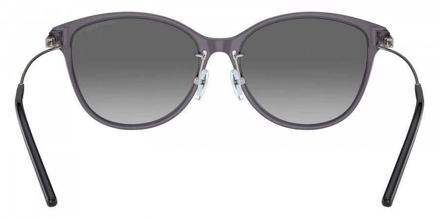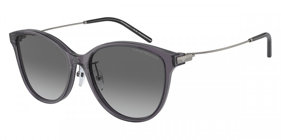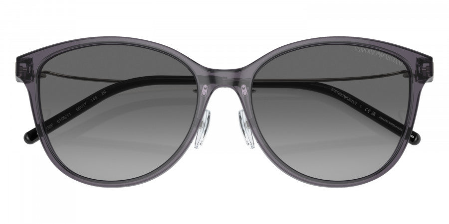 Emporio Armani EA4220F 610611 56 sunglasses in Shiny Transparent Black/Shiny Gunmetal. The 610611 Shiny Transparent Black/Shiny Gunmetal color frame is complimented with Gradient Gray finish lenses. This model features Acetate and Metal Cat-Eye Shape in size 56-17-145.