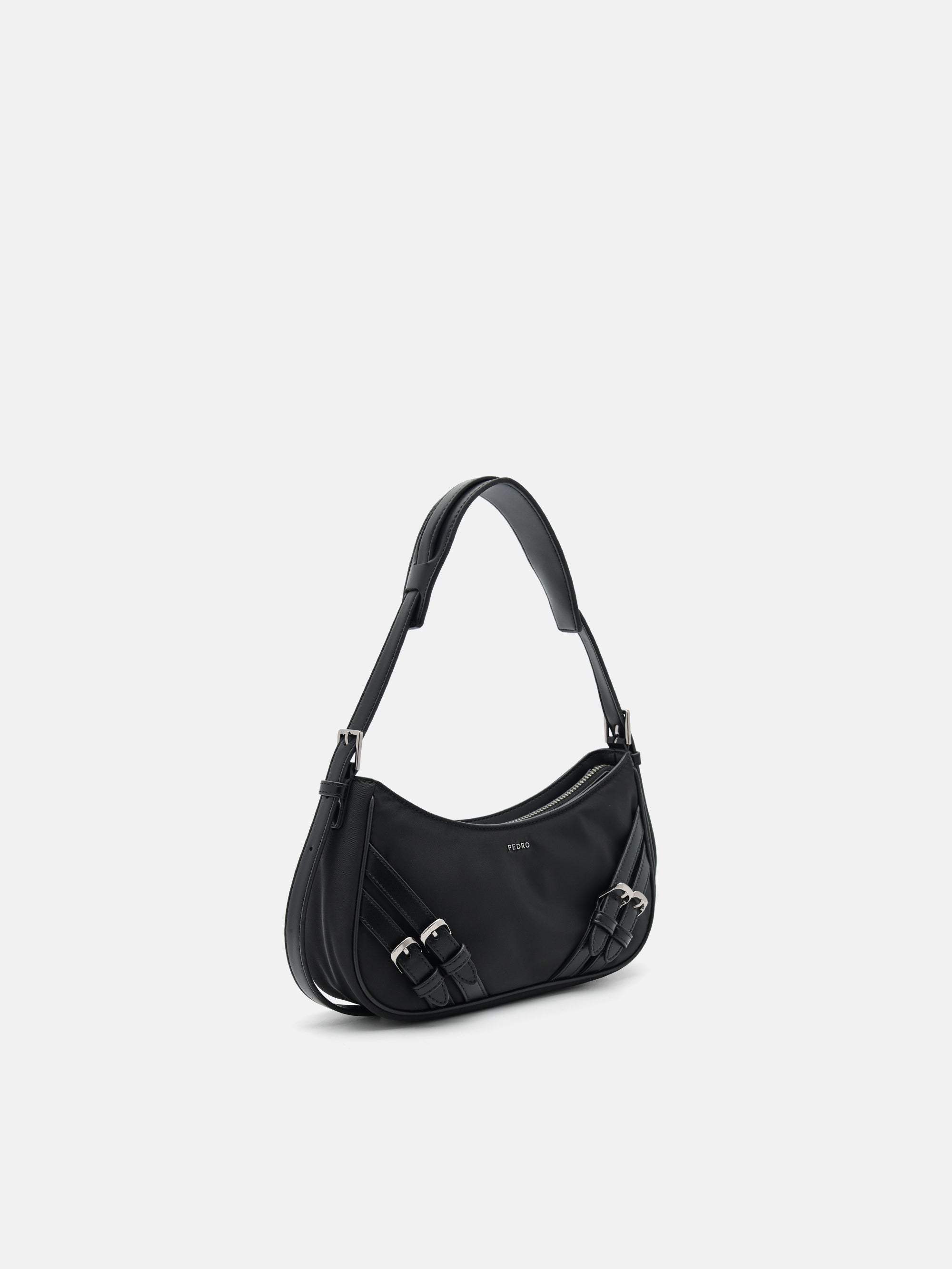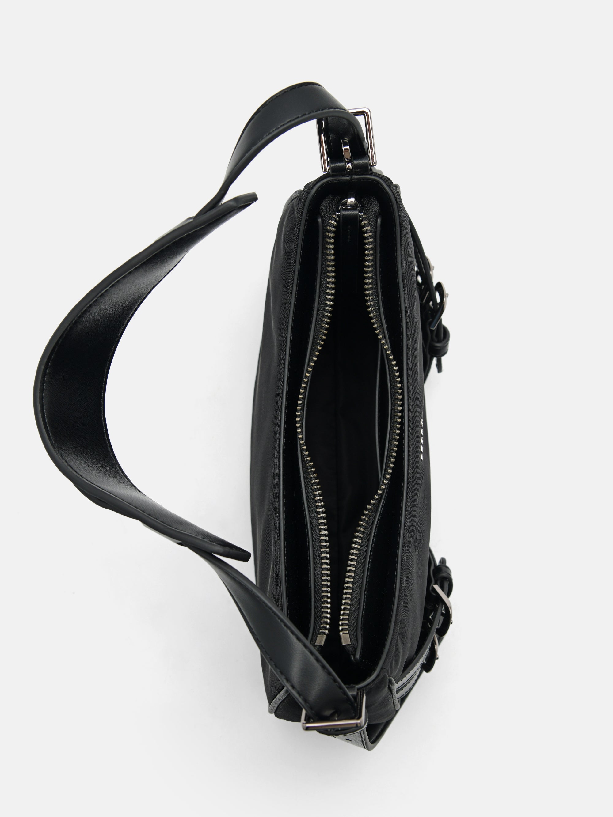 A bag designed not just to carry, but to command attention. With its modern, multi-buckled design, this piece is a bold statement of precision and innovation. The rounded form, shaped by curves that challenge the expected, is crafted in durable nylon with intricate buckle detailing adding depth to its contemporary silhouette.