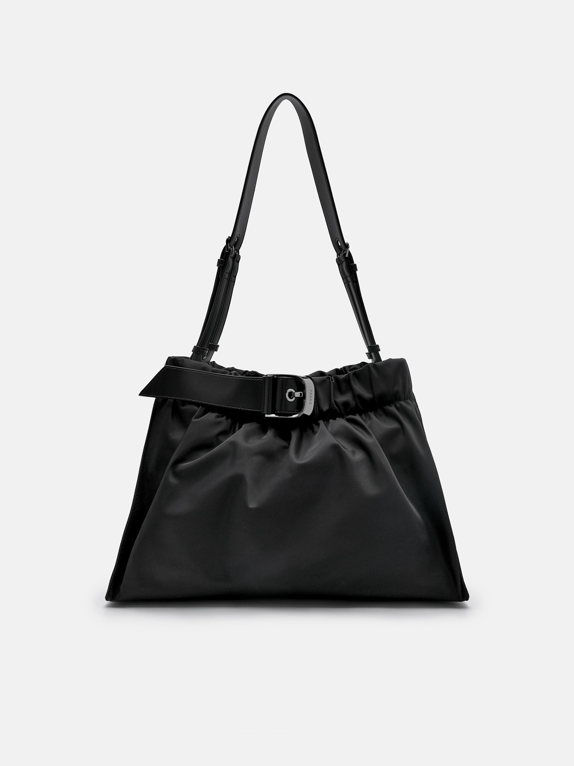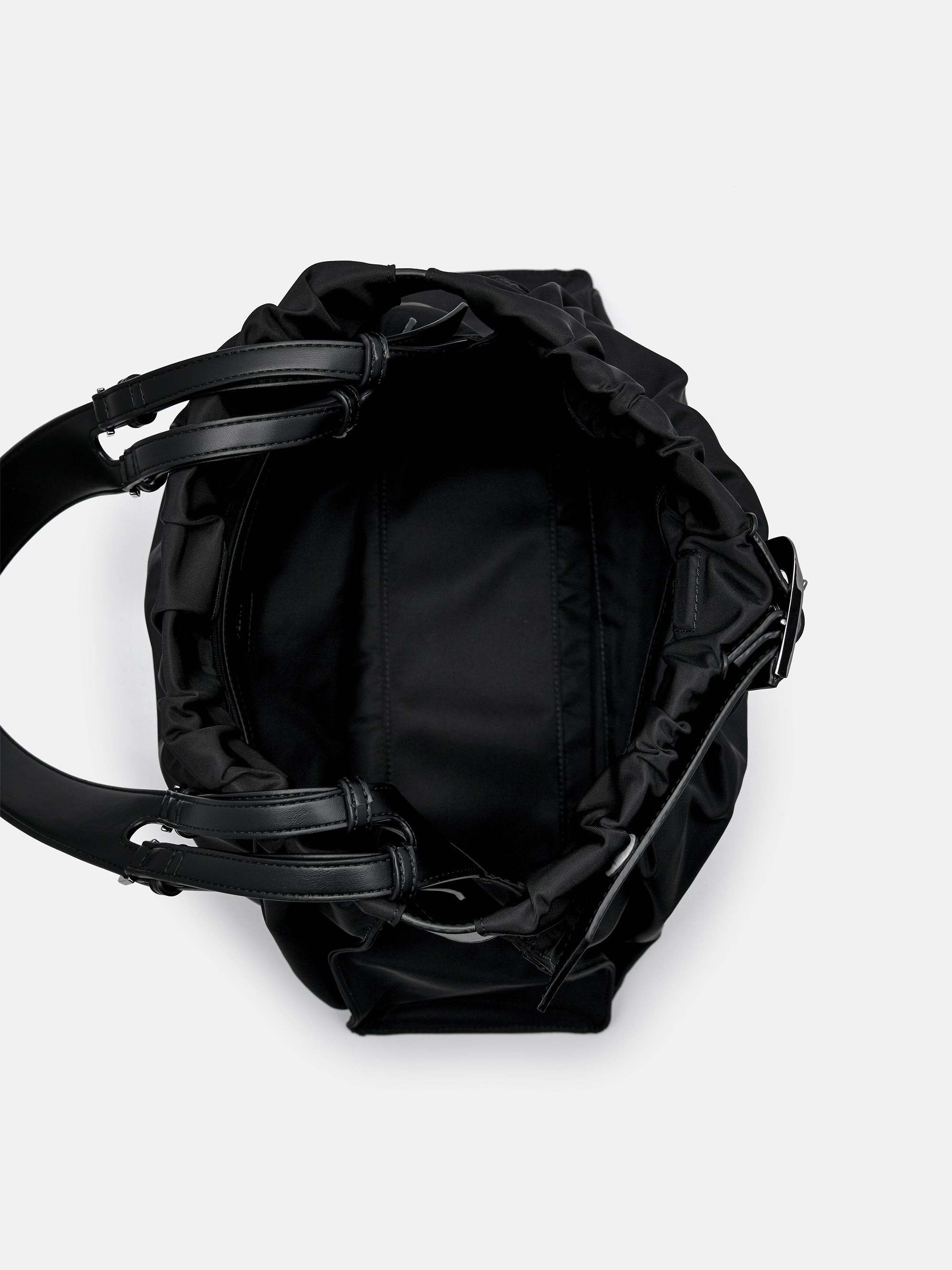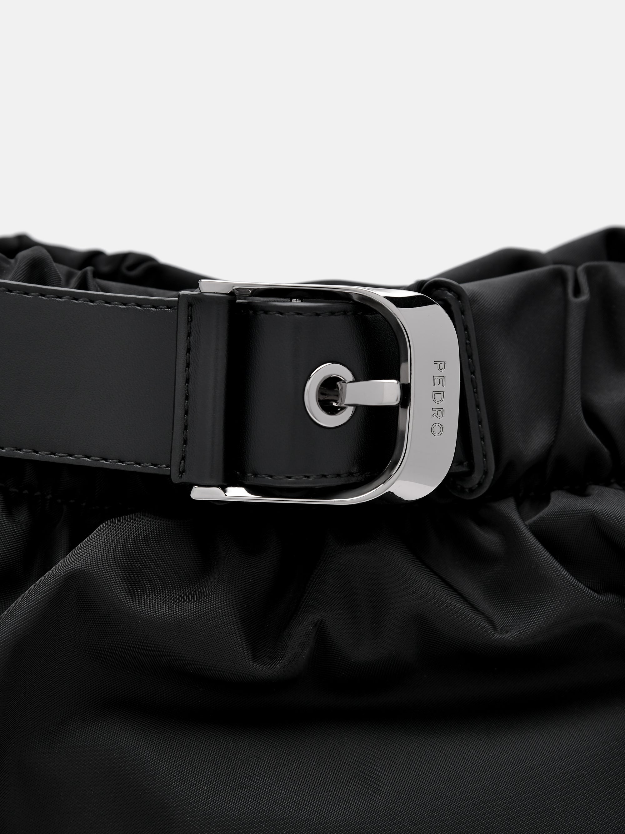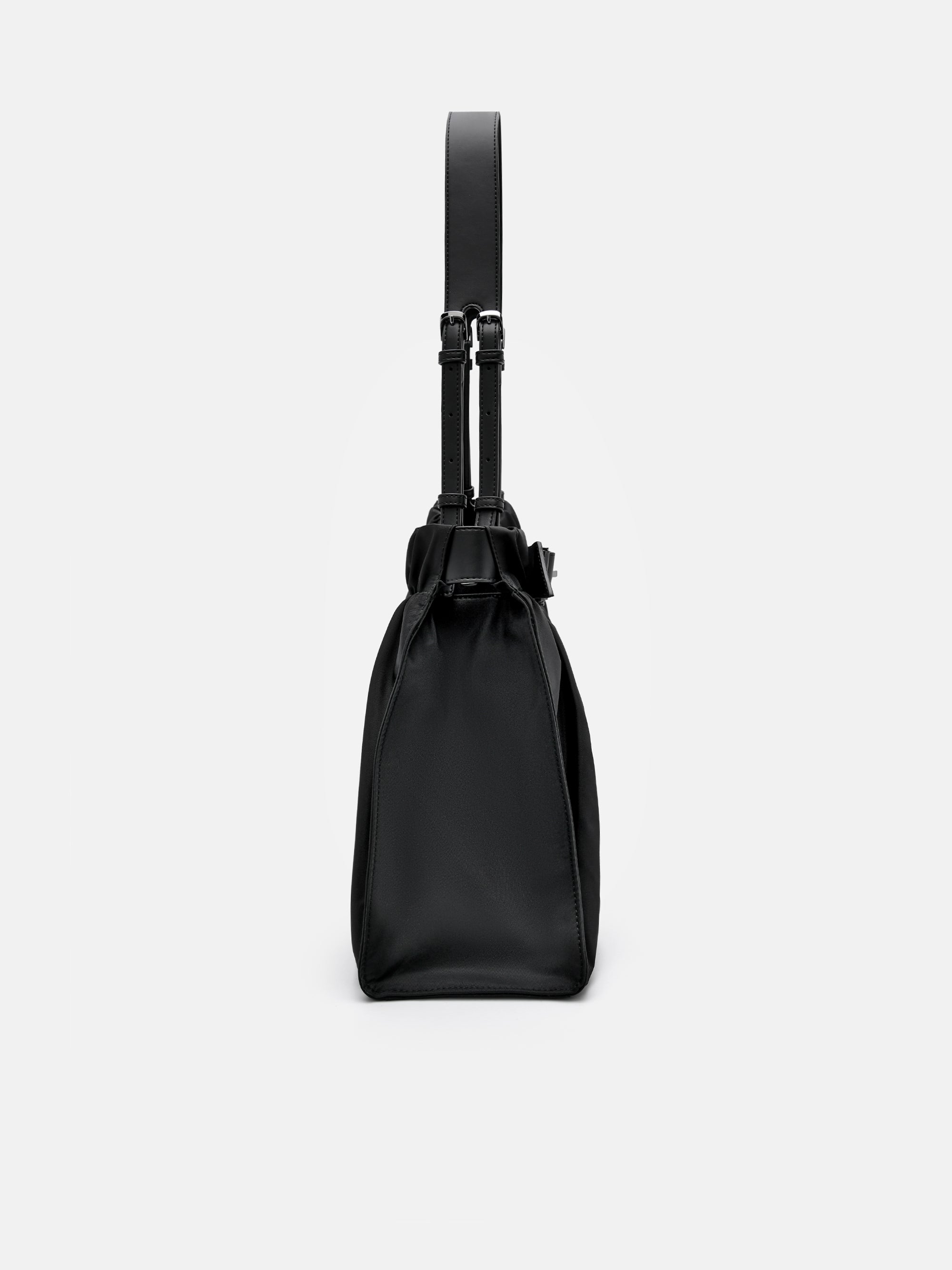 Softly structured, this piece moves with ease yet holds its form. The ruched nylon surface brings a quiet tactility, balanced by the sharp angles of its outline. Finished with a concealed magnetic closure, it sits neatly under the arm, offering a clean and modern carry for everyday clarity.